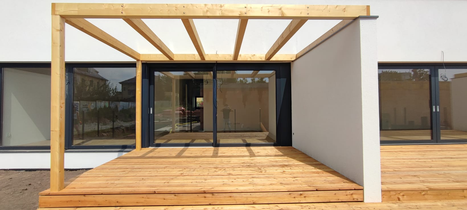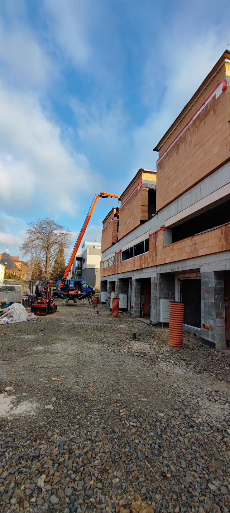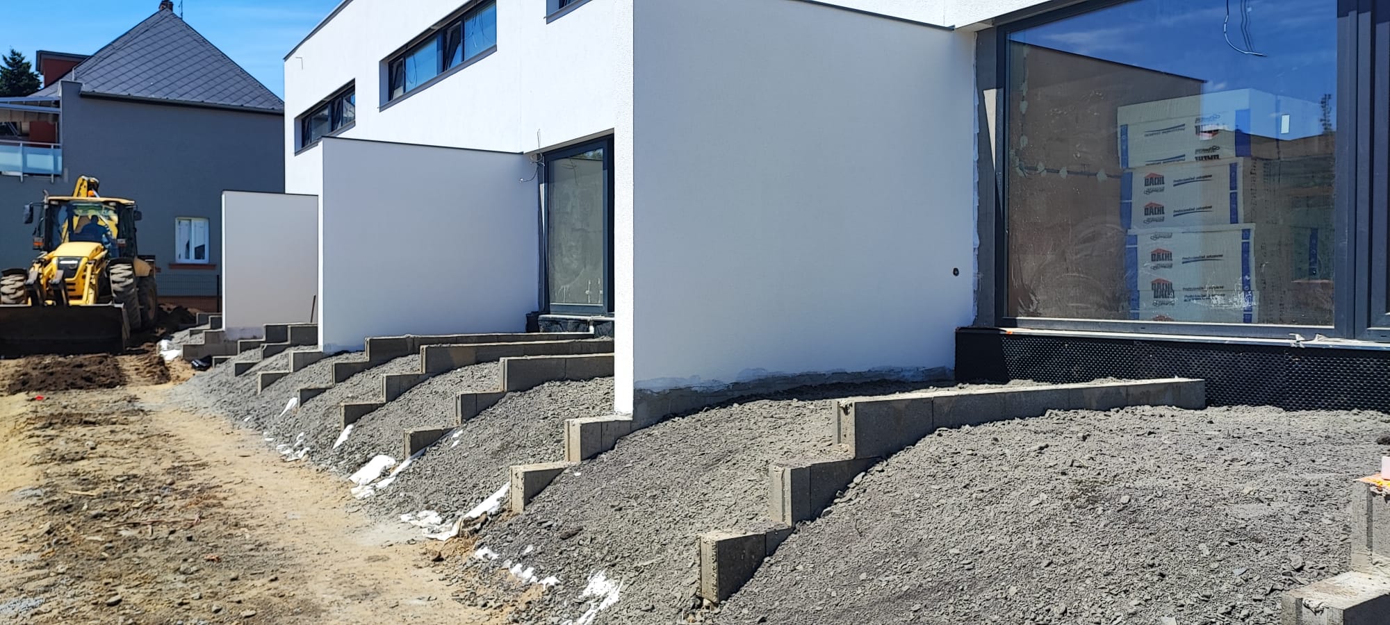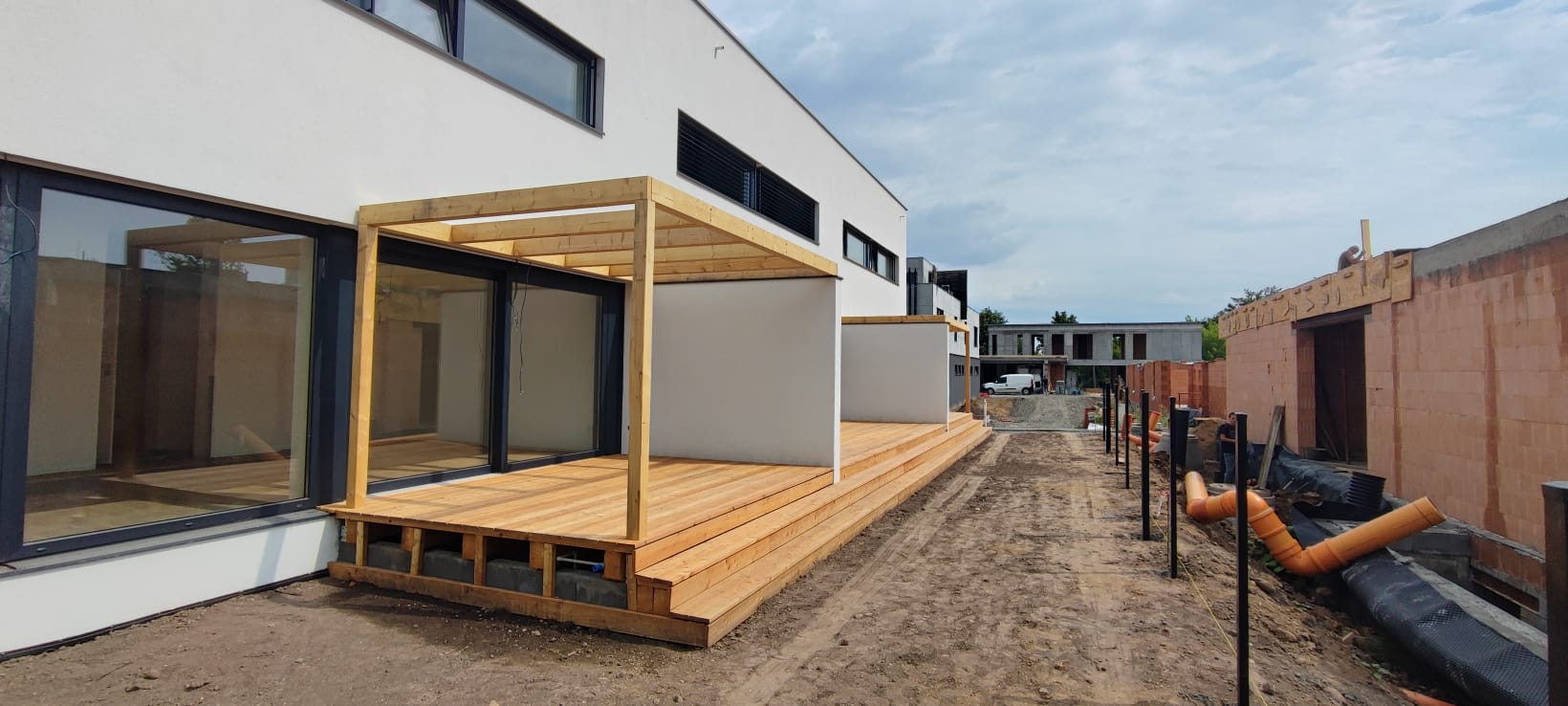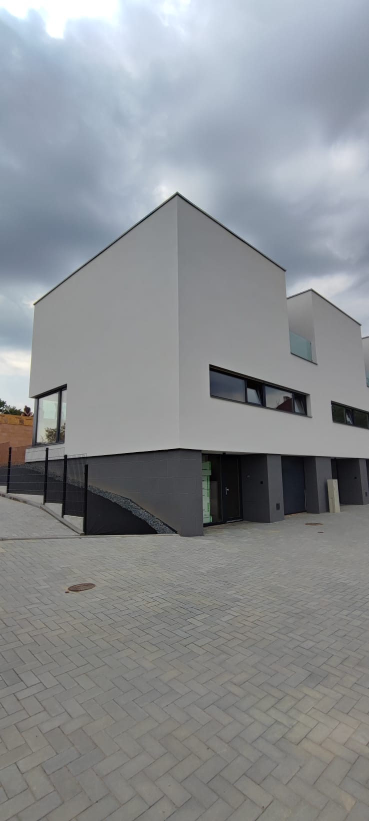 Architektonické řešení: Řadové domy využívají svažitý pozemek, z jižní strany jsou dvojpodlažní, ze severní vstupní strany jsou dvě nadzemní podlaží doplněna o podlaží podzemní. Výškově jsou domy nižší než stávající okolní zástavba. Ze severní strany je jednoduchý objem rytmizován lodžiemi, ze strany jižní dřevěnými terasami s pergolou. Předání domů majitelům je naplánováno na konec roku 2021.